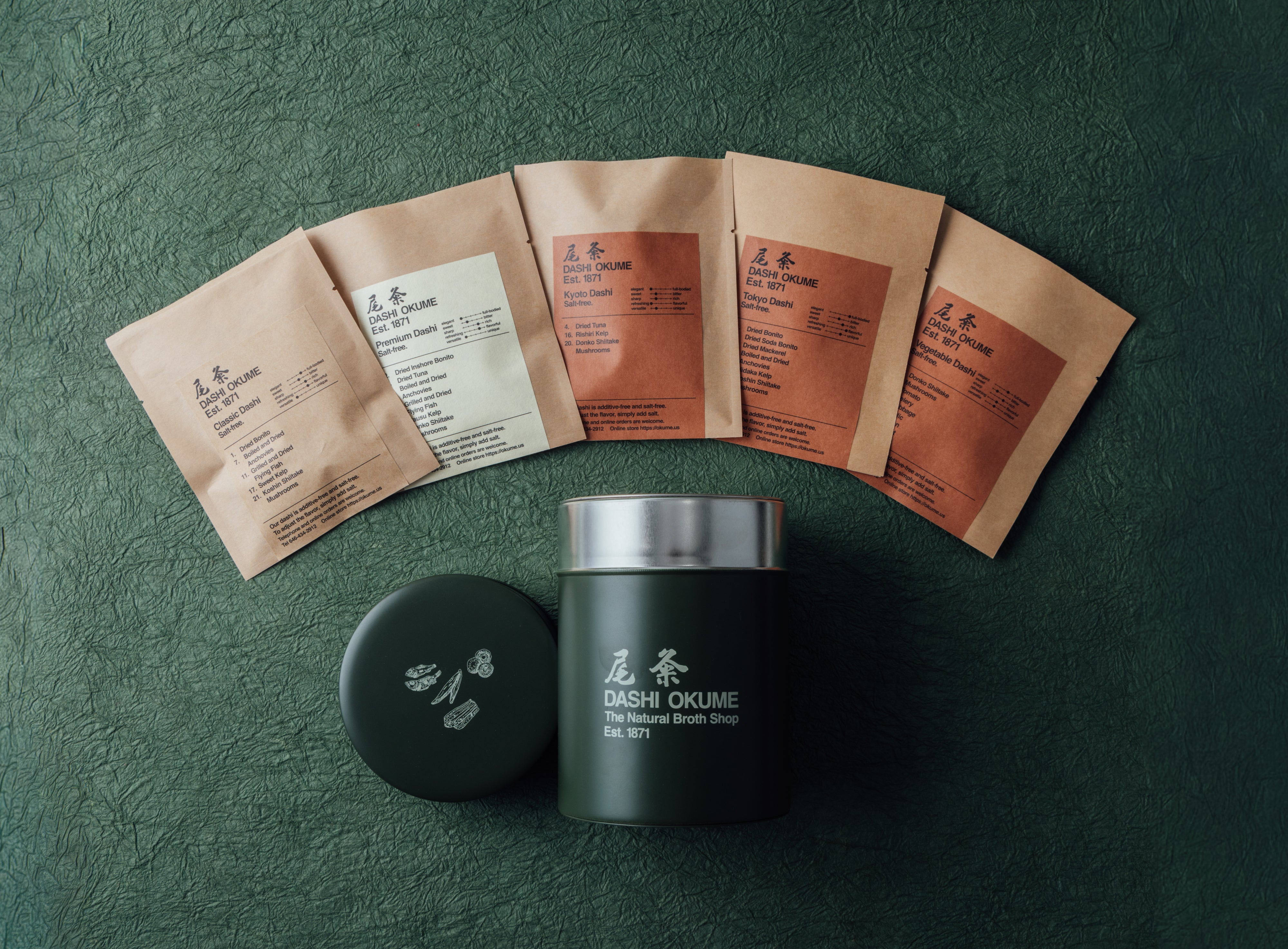 A heritage canister with five dashi varieties, handcrafted in Japan